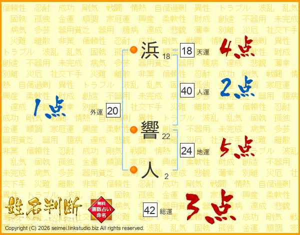 生活面を象徴する運勢です。外部から受ける影響力を表し、結婚運、家庭運や職場、環境への順応性を表します。総運から人運を引いた画数。姓や名が1文字の場合を除く。