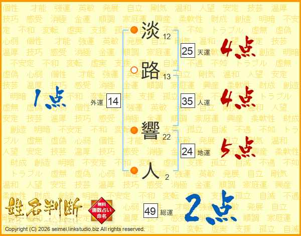 生活面を象徴する運勢です。外部から受ける影響力を表し、結婚運、家庭運や職場、環境への順応性を表します。総運から人運を引いた画数。姓や名が1文字の場合を除く。