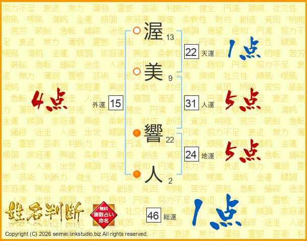 生活面を象徴する運勢です。外部から受ける影響力を表し、結婚運、家庭運や職場、環境への順応性を表します。総運から人運を引いた画数。姓や名が1文字の場合を除く。