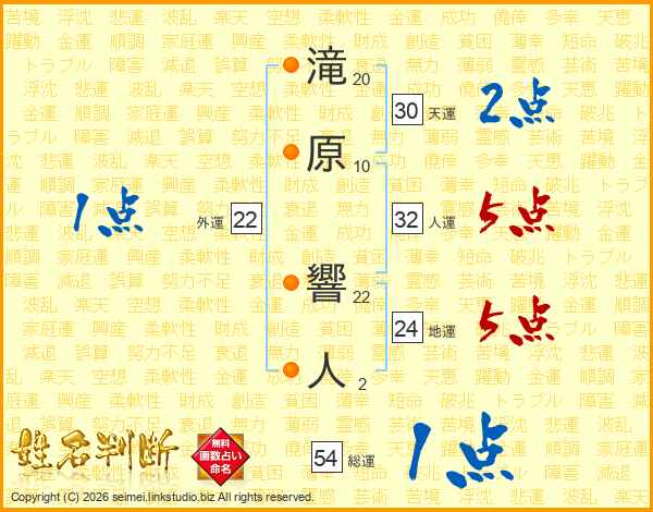生活面を象徴する運勢です。外部から受ける影響力を表し、結婚運、家庭運や職場、環境への順応性を表します。総運から人運を引いた画数。姓や名が1文字の場合を除く。