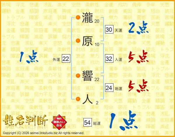 生活面を象徴する運勢です。外部から受ける影響力を表し、結婚運、家庭運や職場、環境への順応性を表します。総運から人運を引いた画数。姓や名が1文字の場合を除く。