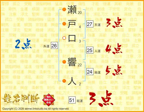 瀬戸口響人さんの総運は51画の3点!