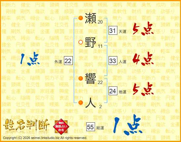 瀬野響人さんの総運は55画の1点!