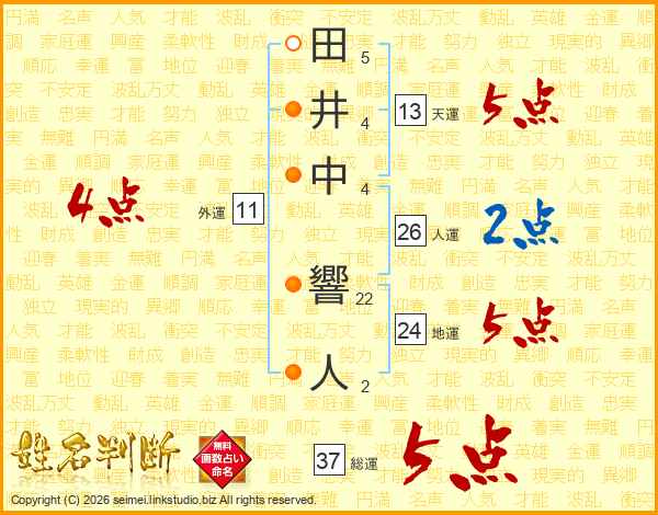 田(5画)井(4画)中(4画) 響(22画)人(2画)