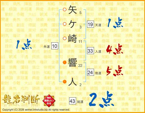 矢(5画)ケ(3画)崎(11画) 響(22画)人(2画)