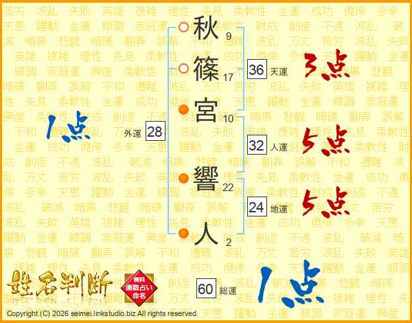 秋(9画)篠(17画)宮(10画) 響(22画)人(2画)