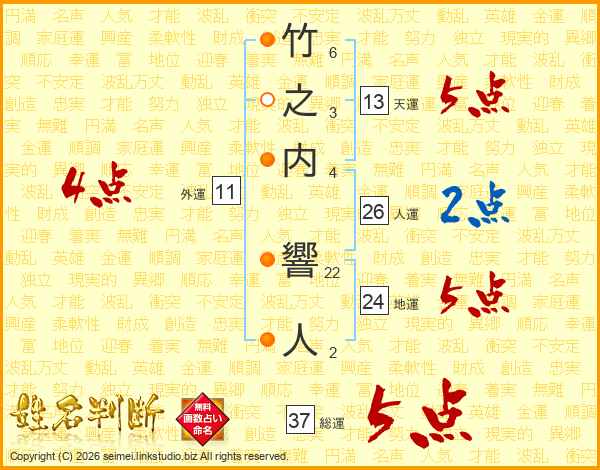 竹之内響人さんの総運は37画の5点!