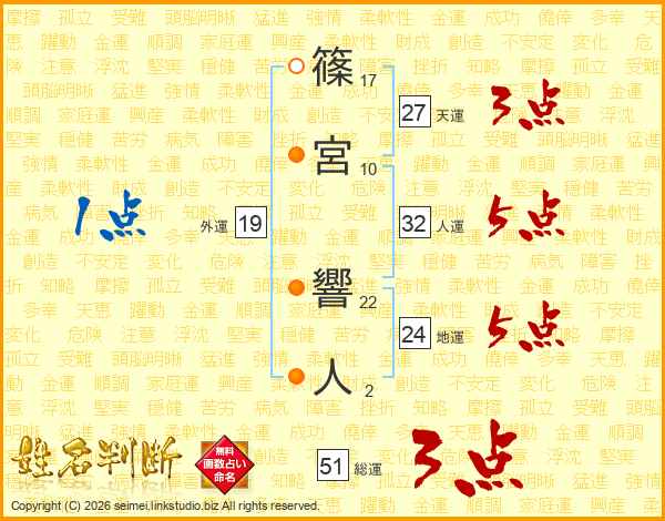 生活面を象徴する運勢です。外部から受ける影響力を表し、結婚運、家庭運や職場、環境への順応性を表します。総運から人運を引いた画数。姓や名が1文字の場合を除く。