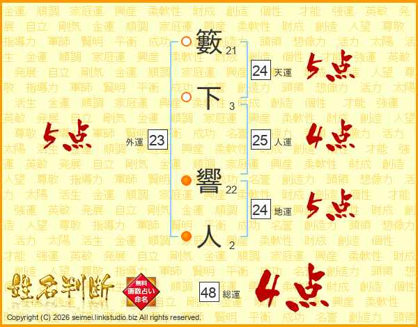生活面を象徴する運勢です。外部から受ける影響力を表し、結婚運、家庭運や職場、環境への順応性を表します。総運から人運を引いた画数。姓や名が1文字の場合を除く。
