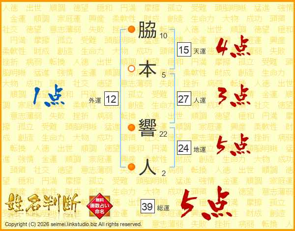 生活面を象徴する運勢です。外部から受ける影響力を表し、結婚運、家庭運や職場、環境への順応性を表します。総運から人運を引いた画数。姓や名が1文字の場合を除く。