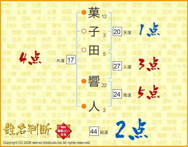 菓(12画)子(3画)田(5画) 響(22画)人(2画)