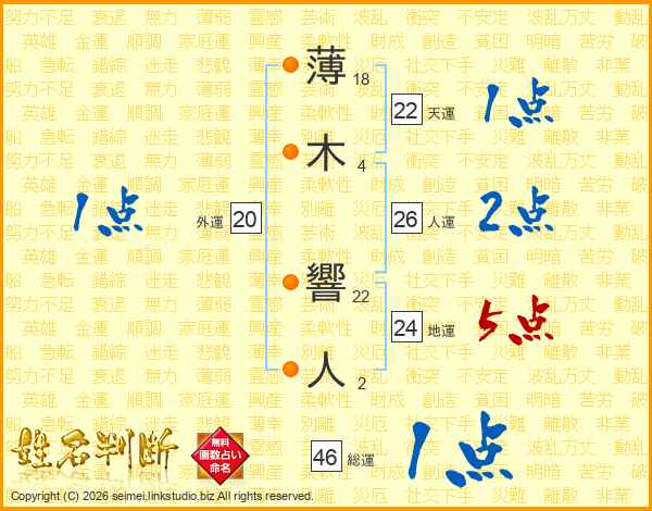 薄木響人さんの総運は46画の1点!