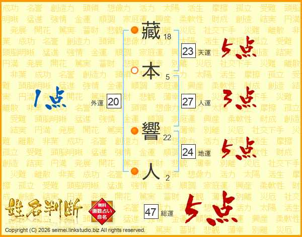 藏本響人さんの総運は47画の5点!