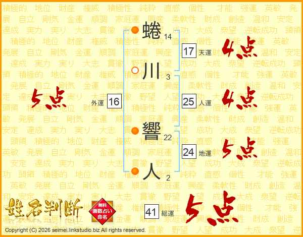 生活面を象徴する運勢です。外部から受ける影響力を表し、結婚運、家庭運や職場、環境への順応性を表します。総運から人運を引いた画数。姓や名が1文字の場合を除く。