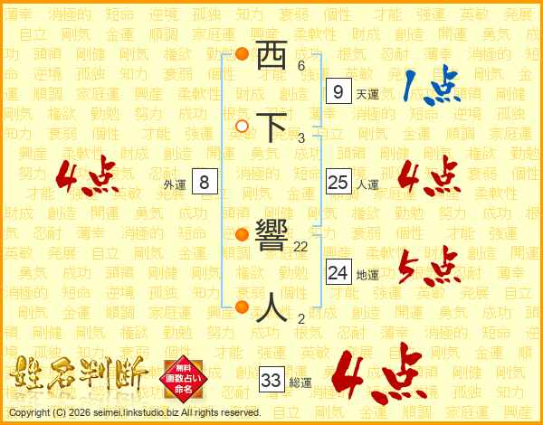 西下響人さんの総運は33画の4点!