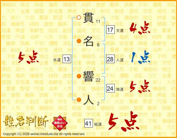 貫名響人さんの総運は41画の5点!