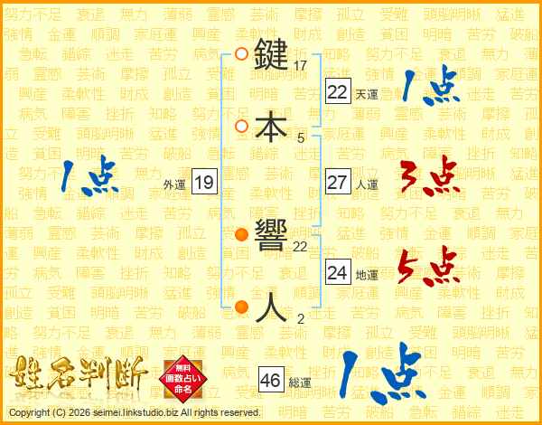 鍵本響人さんの総運は46画の1点!