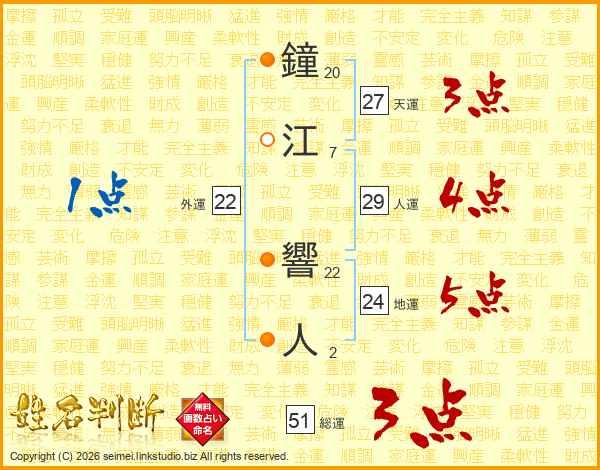 生活面を象徴する運勢です。外部から受ける影響力を表し、結婚運、家庭運や職場、環境への順応性を表します。総運から人運を引いた画数。姓や名が1文字の場合を除く。
