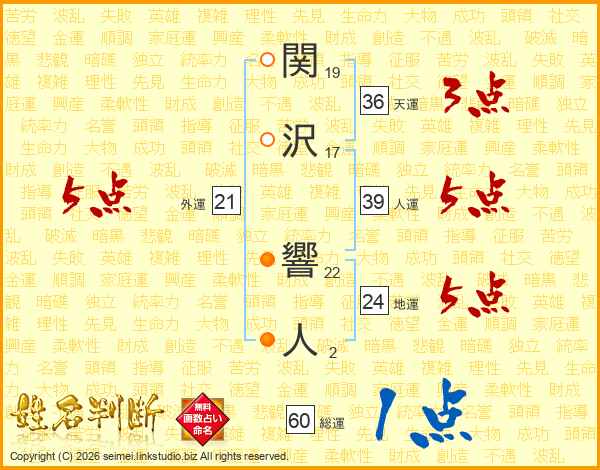 生活面を象徴する運勢です。外部から受ける影響力を表し、結婚運、家庭運や職場、環境への順応性を表します。総運から人運を引いた画数。姓や名が1文字の場合を除く。