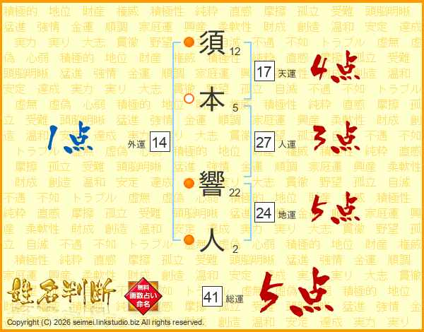 須本響人さんの総運は41画の5点!