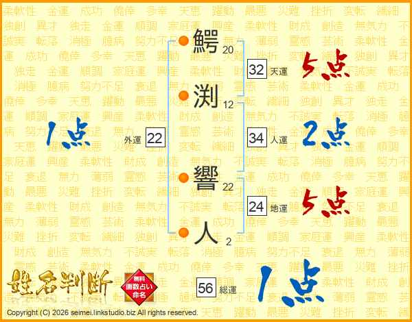 鰐(20画)渕(12画) 響(22画)人(2画)
