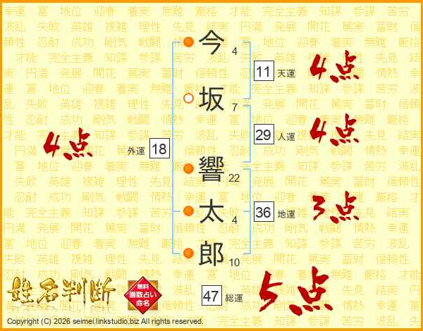 今(4画)坂(7画) 響(22画)太(4画)郎(10画)