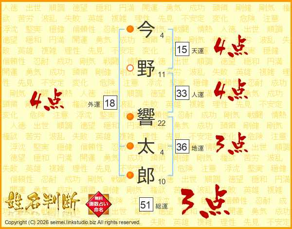 今野響太郎さんの人運は33画の4点!