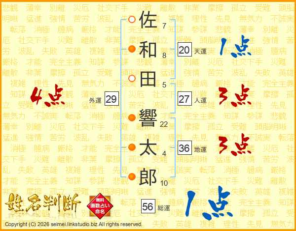 佐(7画)和(8画)田(5画) 響(22画)太(4画)郎(10画)