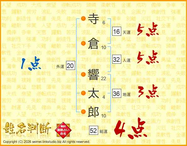 寺倉響太郎さんの総運は52画の4点!