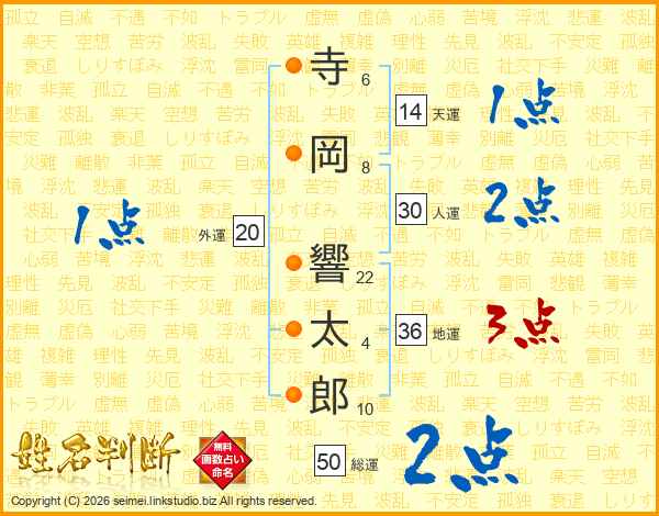 寺(6画)岡(8画) 響(22画)太(4画)郎(10画)