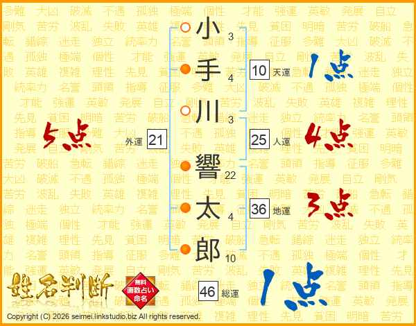 小(3画)手(4画)川(3画) 響(22画)太(4画)郎(10画)
