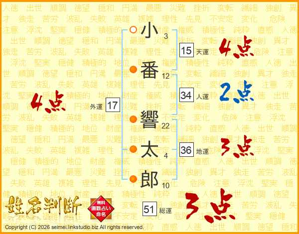 小(3画)番(12画) 響(22画)太(4画)郎(10画)