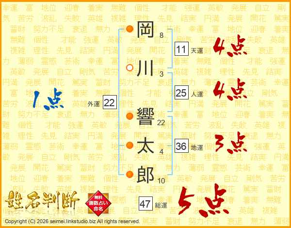 岡(8画)川(3画) 響(22画)太(4画)郎(10画)