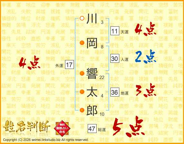 川岡響太郎さんの総運は47画の5点!