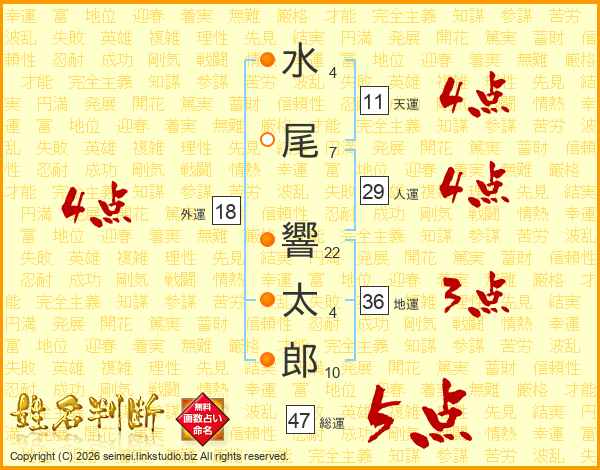 水(4画)尾(7画) 響(22画)太(4画)郎(10画)