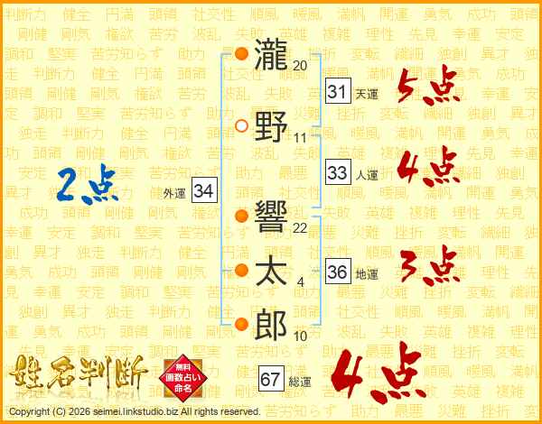 瀧(20画)野(11画) 響(22画)太(4画)郎(10画)