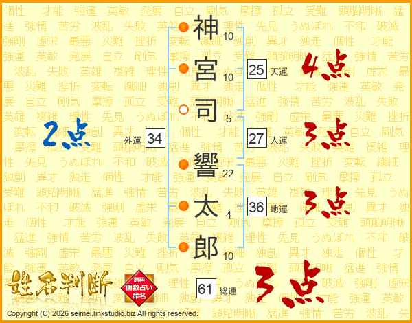 神(10画)宮(10画)司(5画) 響(22画)太(4画)郎(10画)