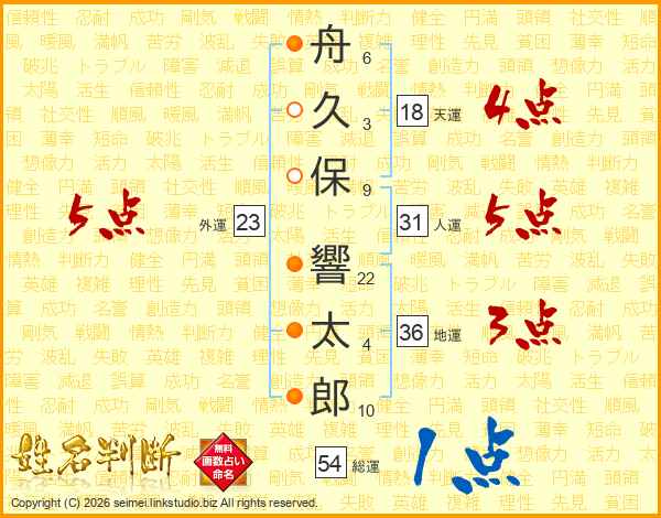 舟(6画)久(3画)保(9画) 響(22画)太(4画)郎(10画)