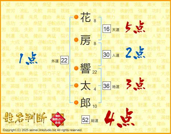 花(8画)房(8画) 響(22画)太(4画)郎(10画)