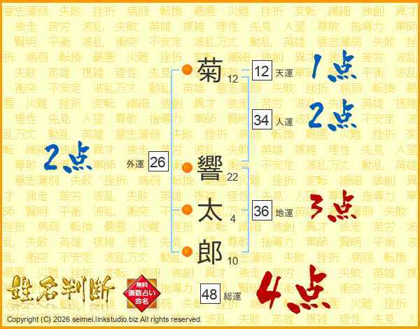 画数の奇数(○陽)と偶数(●陰)の配列で吉凶を占います。どちらかにかたよる名前は大凶名で避ける必要があります。画数の奇数偶数。