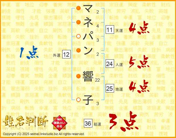 マ(2画)ネ(4画)パ(3画)ン(2画) 響(22画)子(3画)