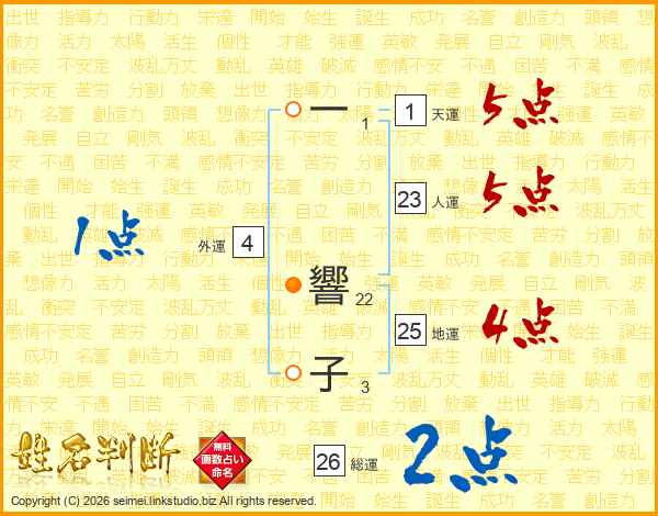 生活面を象徴する運勢です。外部から受ける影響力を表し、結婚運、家庭運や職場、環境への順応性を表します。総運から人運を引いた画数。姓や名が1文字の場合を除く。