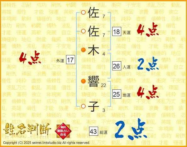 佐(7画)佐(7画)木(4画) 響(22画)子(3画)
