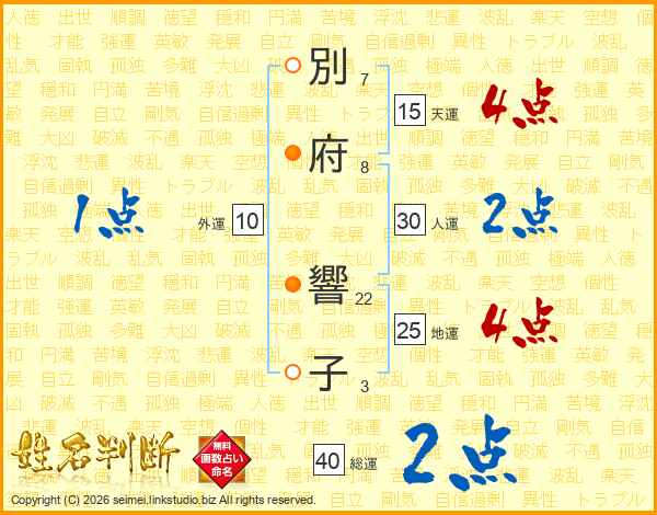 生活面を象徴する運勢です。外部から受ける影響力を表し、結婚運、家庭運や職場、環境への順応性を表します。総運から人運を引いた画数。姓や名が1文字の場合を除く。