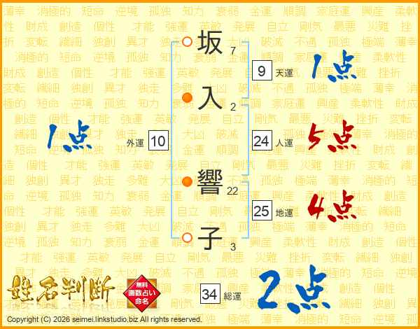 生活面を象徴する運勢です。外部から受ける影響力を表し、結婚運、家庭運や職場、環境への順応性を表します。総運から人運を引いた画数。姓や名が1文字の場合を除く。