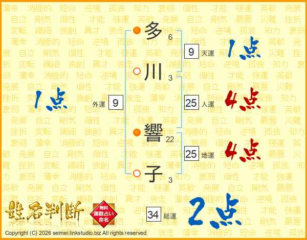 生活面を象徴する運勢です。外部から受ける影響力を表し、結婚運、家庭運や職場、環境への順応性を表します。総運から人運を引いた画数。姓や名が1文字の場合を除く。
