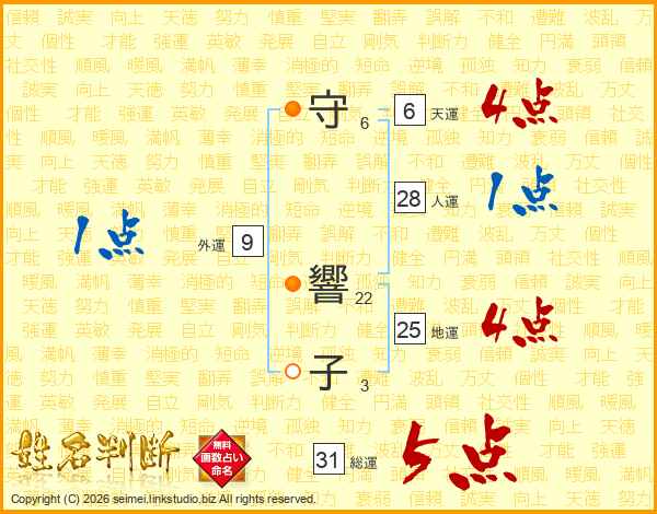 生活面を象徴する運勢です。外部から受ける影響力を表し、結婚運、家庭運や職場、環境への順応性を表します。総運から人運を引いた画数。姓や名が1文字の場合を除く。
