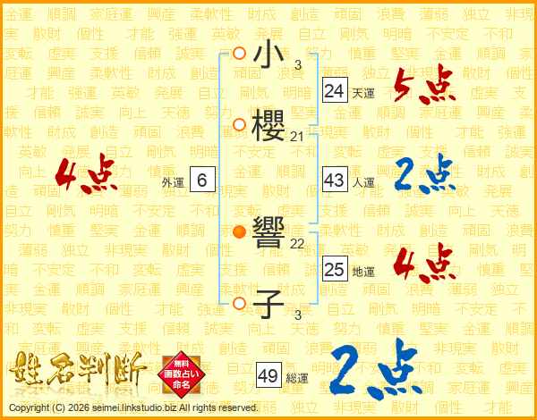 小(3画)櫻(21画) 響(22画)子(3画)