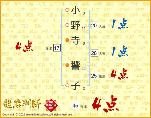 小(3画)野(11画)寺(6画) 響(22画)子(3画)