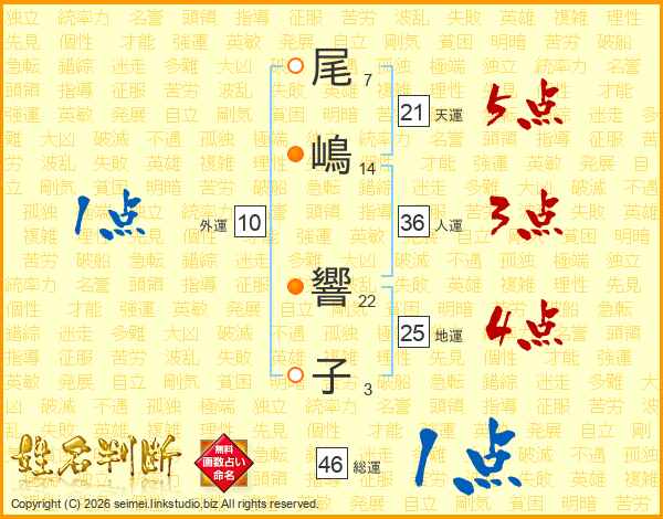 尾(7画)嶋(14画) 響(22画)子(3画)